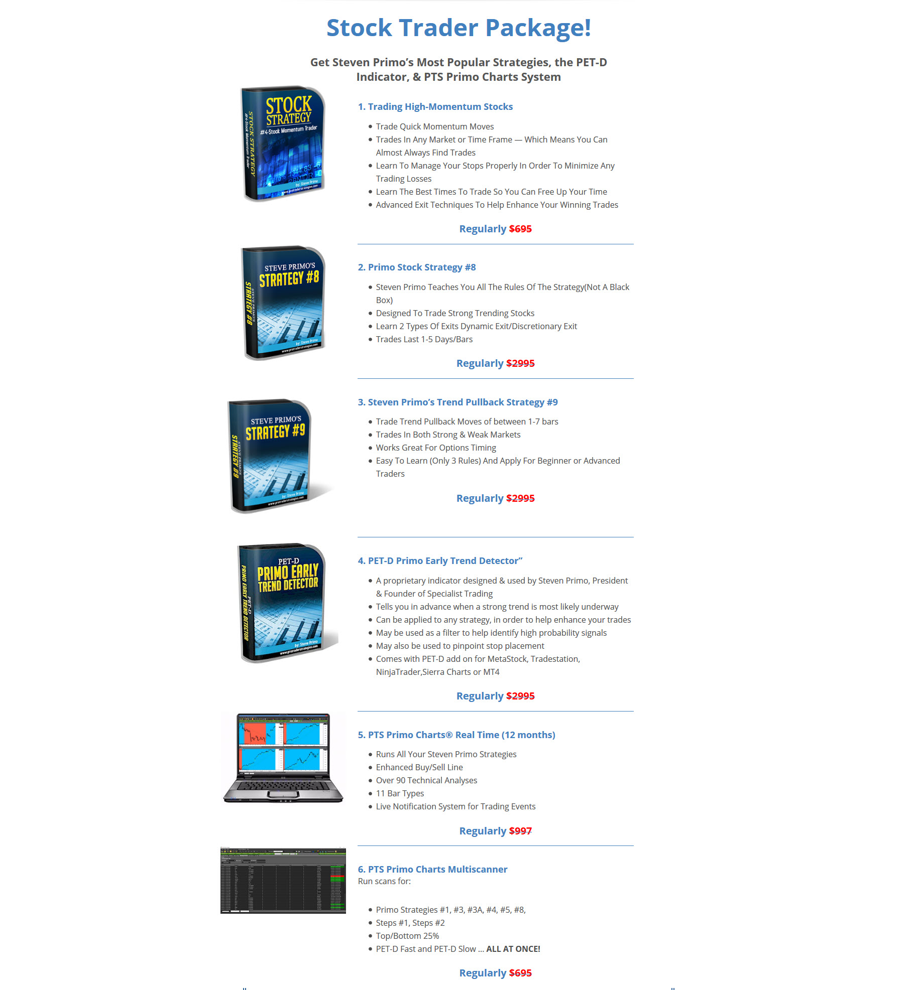 | | Did you have an interest in Steven Primo's Ultimate Stock Trader Package? We wanted to give you this special discounted upgrade offer good through July 31 only. This really is a chance of a lifetime to learn from someone who has been trading the markets for over 40 years and he makes it simple for you to learn. p.s. Hit reply with questions or if you want to hear payment plan options. (Limited # of Payment Plans Available So Reply Now) Here is more info... | | Steven Primo has been actively involved in trading the markets for over 41 years. His trading tenure began in 1977 when he was hired to work as a Floor Reporter, or runner, on the floor of the Pacific Stock Exchange. Primo reached the pinnacle of his floor-trading career when he became a Stock Exchange Specialist for Donaldson, Lufkin, and Jenrette. As a Specialist he was responsible for making markets in over 50 stocks, a position Primo held for 9 years. Primo left the Stock Exchange floor in 1994 to focus on managing money and to teach his own unique approach to trading the markets. | Steve has also been featured in Stocks and Commodities magazine and is a frequent contributor to many sites such as TradingMarkets, FXStreet, Forex Pros and Traders Expo. His strategies are now traded across the globe in over 116 countries on 6 continents. If you have any questions or would like to learn more about a payment plan feel free to contact us at: 310 598-6677 or trading@protraderstrategies.com | | | | | Pro Trader Strategies 11222 S La Cienega Blvd Los Angeles, California 90304 United States (310) 598-6677 | | |