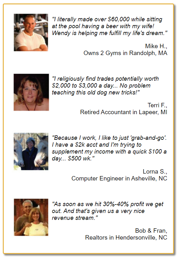 Results described in testimonials from other products or the product being offered may not be typical or representative of results achieved by other users of such products. No representation is being made that any of the persons who provide testimonials have continued to experience the same level of profitable trading after the date on which the testimonial was provided. In fact, such persons may have experienced losses immediately thereafter or may have experienced losses preceding the period of time referenced in the testimonial. No representation is being made that you will achieve profits or the same results as any person providing a testimonial. Wendy Kirkland's experiences are not typical. Wendy Kirkland is an experienced investor and your results will vary depending on risk tolerance, amount of risk capital utilized, size of trading position, willingness to follow the rules and other factors.