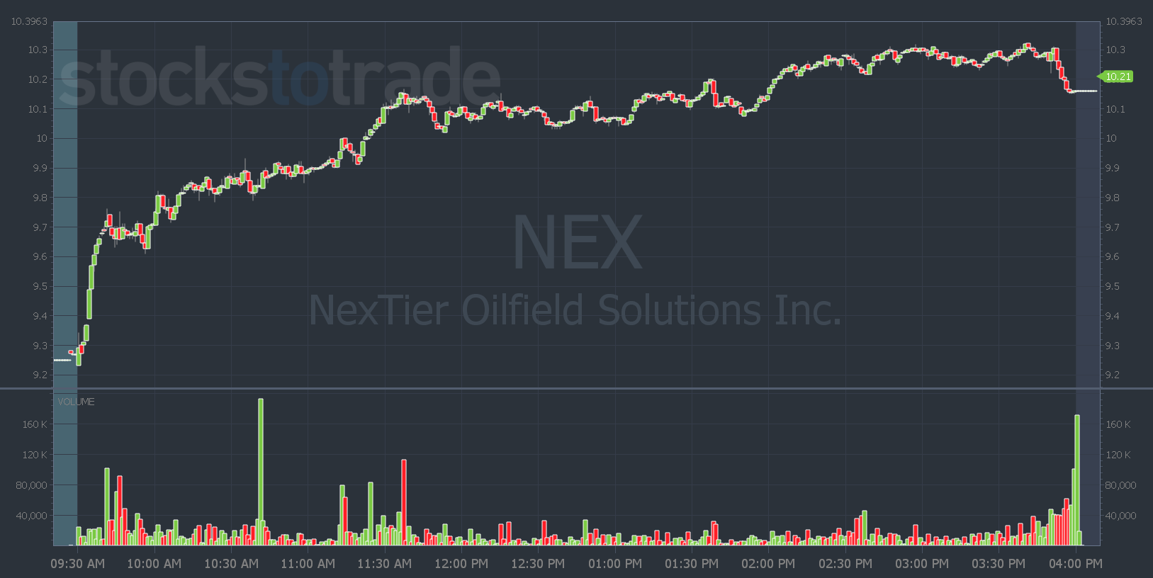 I ran StocksToTrade's prebuilt energy breakout scan on Friday afternoon. Here's what it gave me… See that? 45 results. And the second biggest percent gainer on the list was NexTier Oilfield Solutions Inc. (NYSE: NEX).