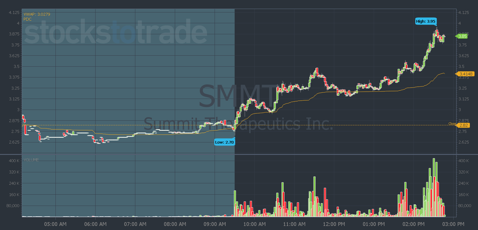SMMT chart: 1-day, 1-minute candle — courtesy of StocksToTrade.com