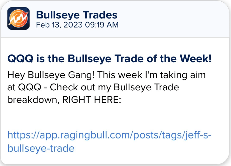 | Remember, these are my best ideas as a 20+ year trader, because I want you to access the best ideas available. | Sometimes I have 2-3 targets on a trade. Others might be 1. Because I don't trade just to trade. | If I don't like what the market's showing me, my intention isn't to assume unnecessary risk. | But rest assured, you'll get a trade plan + exact option contract like this BEFORE I buy. | | You'll access my plan. | I don't care where your trading is today. Bullseye's on steroids and I'm here to help. | | This is the BEST time ever to join my service. | It's the definition of a "no-brainer" price and INCLUDES my further "no-brainer" guarantee. | | So for a price that's less than 10% of what will be the price extremely soon, what's not to love? | Join me right here before this price soars more than 10X. | | P.S. I'm here for readers like you. With any reasons why you're not joining at this ludicrous rate, shoot me a reply. | I'll review each with detail, and work with you to maximize your value with this quickly expiring $9 opportunity! | | | | Questions or concerns about our products? Email Support@ragingbull.com © Copyright 2022, RagingBull | | | DISCLAIMER To more fully understand any Ragingbull.com, LLC ("RagingBull") subscription, website, application or other service ("Services"), please review our full disclaimer located at https://ragingbull.com/disclaimer |