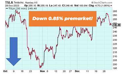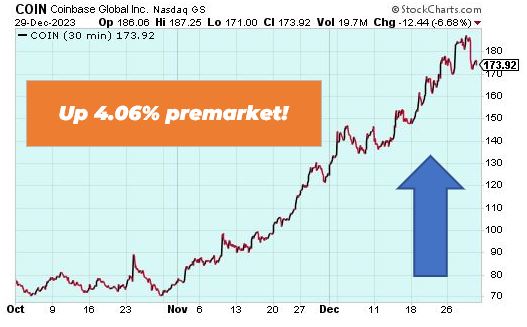 | Attention Traders: Our Head Trading Tactician Bryan Bottarelli has a special bonus video for you today. Bryan is going over three simple day trading tips to level up your trading. Click the image below to get all the details. P.S. Every Wednesday Bryan makes one simple trade that takes advantage of a unique phenomenon in the markets. Right now he's guaranteeing an 80% win rate on this move. Click here to unlock his next Wednesday trade. Good Morning Wake-Up Watchlisters! While you're sipping coffee you'll see stock futures dipped on Tuesday after the holiday. US treasuries tip-toed into 2024 as traders trimmed their bets on interest-rate cuts this year. Oil prices also spiked as tensions in the Red Sea intensified. As we enter 2024, our trading tacticians are ready for another incredible year in The War Room. In 2023, they posted a 72% win rate and right now they're guaranteeing you'll receive 252 winning trades in your first 12 months of membership. Click here to start the year trading with more confidence today. Coinbase Global (Nasdaq: COIN) Coinbase Global is up 4.06% in premarket trading after several changes to its business model is helping improve revenue. Before the bear market in 2022, Coinbase was heavily dependent on transaction fees, which accounted for over 90% of its total revenue at one point. Yet, thanks to its recent efforts, only 53% of its revenue comes from transaction fees today thanks to its innovative "Subscription and Services" product suite. The new move has helped put the company only $2 million away from an actual profit. |