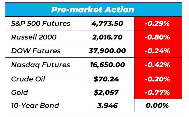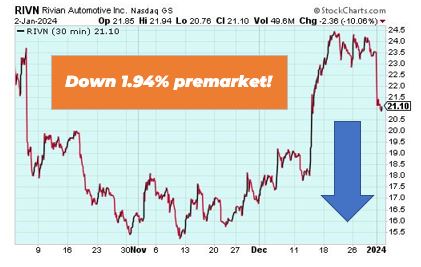 | Good Morning Wake-Up Watchlisters! While you're sipping coffee you'll see stock futures fell on Wednesday after fresh jobs data caused optimism for interest-rate cuts to dip. Hopes that the year-end market rally would roll into 2024 hit a snag as indexes closed to their worst start in decades. Overall, the JOLTS report on job openings will set the fed's expectations for the labor market and for the December monthly jobs report on Friday. Despite the volatile 2024 start in the markets, we were on fire on The War Room yesterday. Our Lead Fundamental Tactician Karim Rahemtulla closed 12 winning trades, including 38% gain on TEVA in 433 trading days. Click here to join The War Room and learn our top strategies for consistent winning trades in any market. Here's a look at the top-moving stocks this morning. Moderna, Inc. (Nasdaq: MRNA) Moderna is up 1.70% in premarket trading after the vaccine maker received an upgrade from Oppenheimer & Co Analyst Hartaj Singh. Singh upgraded shares to "outperform," with a price target of $142 per share. Singh based his upgrade on the idea that Covid-19 demand is bottoming and that means new material catalysts are coming to fund the pipeline. Rivian Automotive, Inc. (Nasdaq: RIVN) Rivian is down 1.94% premarket after the electric vehicle company fell short on deliveries in its latest data release. The EV maker said it produced 17,541 units and delivered 13,972 vehicles in the fourth quarter. Analysts had predicted fourth-quarter vehicle deliveries growing 75% to 14,000. Our Lead Technical Tactician Nate Bear is focusing on another top EV company in Daily Profits Live this week. Click here to unlock his latest trade. |