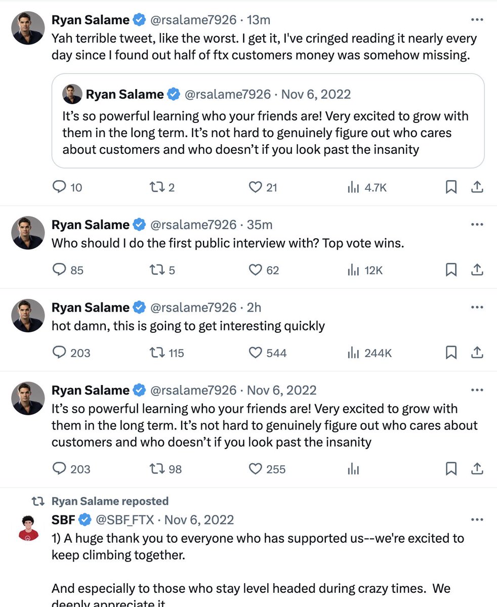 FTX's Ryan Salame has returned to Twitter for the first time since FTX collapsed — hours after he was sentenced to 7.5 years in prison for his role in the FTX fraud and for his illegal campaign contributions 💀 |  | | | May 28, 2024 | | | | | | 162 Likes 20 Retweets 16 Replies |