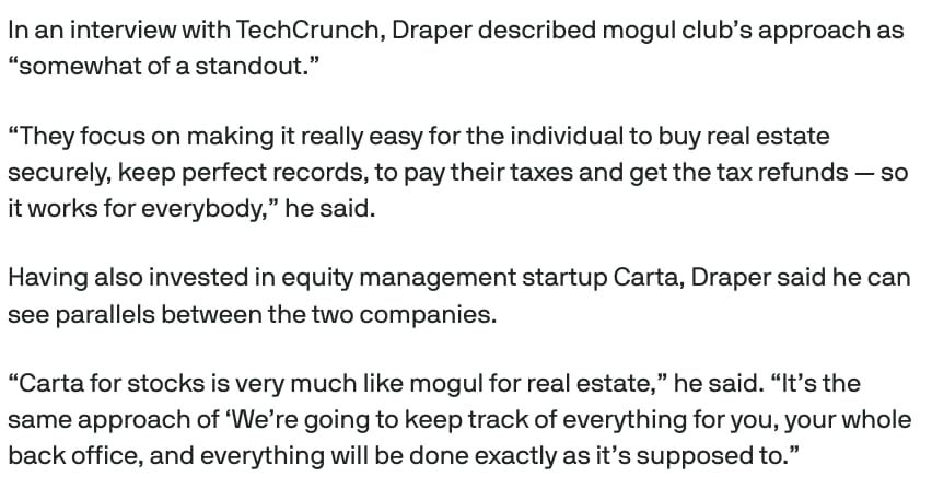| | | | We are excited to participate in mogul's seed extension led by Draper Associates, a Tier-1 venture capital fund. | Mogul is building the infrastructure for real estate investors to invest at scale. | The company is wrapping up their $2.5M seed extension via a SAFE note. | | Company Overview