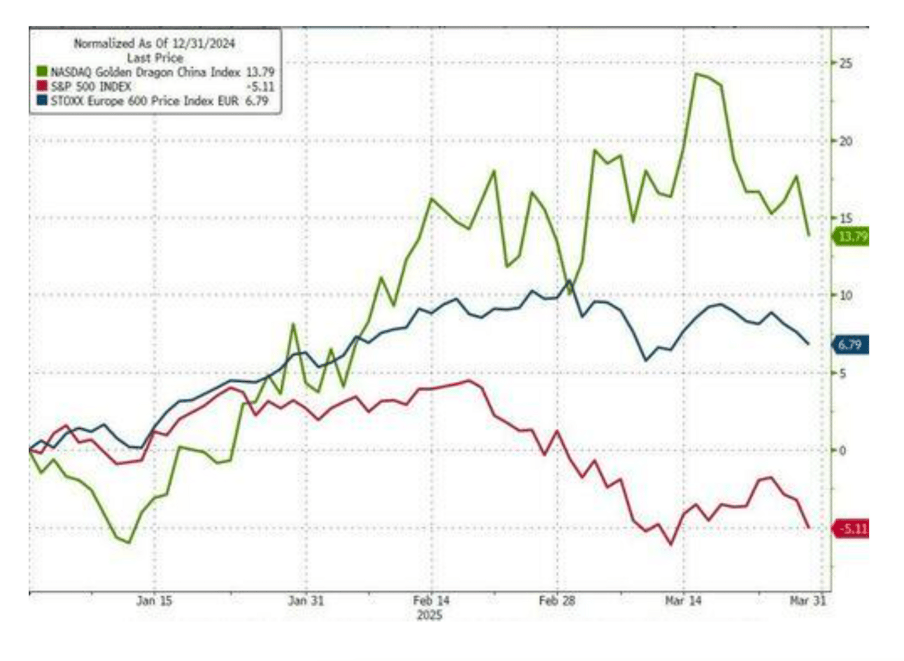 The Green line is the Nasdaq Golden Eagle Index (China), which gained 13.8% at the start of the year. The Blue line is Europe, which is up 6.8%. |