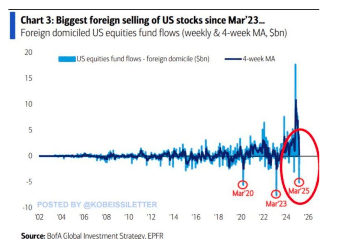 Money flows downhill… and chases places where it can compound, and leverage can be used. Where every dollar can be squeezed. Last week, Bank of America noted the third-largest selling of U.S. stocks on record by foreign investors. The figure totaled $6 billion from U.S. equity funds. That money appears to be going home for now… |