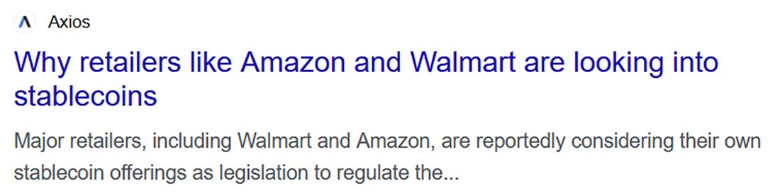 | Amazon and Walmart Are Building Their Own Rails According to recent reports, Amazon (AMZN) and Walmart (WMT) are also considering issuing their own stablecoins - designed to bypass legacy payment systems like Visa and Mastercard. This is a huge deal. Right now, merchants pay 2.5-3% every time a transaction runs through traditional payment rails. Stablecoins, on the other hand, cost less than 0.1% to send across most public blockchains. By launching their own stablecoins, Amazon and Walmart could: - Cut payment fees