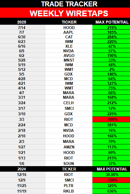 | Hey Guys & Gals, | Jeff Williams here! | Monday is almost here, and the market is buzzing. | Earnings season is in full swing, and with that interest rate decision looming, there's a lot of potential on the horizon. | I'm ready to dive in with a fresh idea, and share it with my community tomorrow at 9 am EST. | But before we get there, I want to talk about consistency. | Because consistency is what truly matters in trading after all. | Take a look at the graphic I've attached to this email. It tells a powerful story about the potential of Weekly Wiretaps. |  | *Note: Trading is hard, results not guaranteed and should not be expected to be replicated typically. |