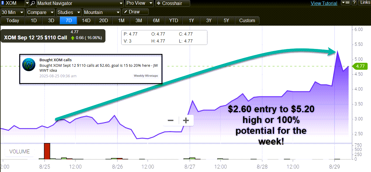 | Hey Guys & Gals, | Jeff Williams here! | With the long weekend here, summer is winding down. | The kids are heading back to school, vacations are over, and for many of us, it's a time to refocus. | That's especially true in the markets. And as we wrapped up this week, I sent a straightforward idea on XOM to my Weekly Wiretaps members. | The alert was simple: "Bought XOM Sept 12 $110 calls at $2.60, goal is 15 to 20% here." | | The result? The trade took off, with those calls hitting a high of $5.20. That was a 100% potential gain. |  | *Note: Trading is hard, results not guaranteed and should not be expected to be replicated typically. |