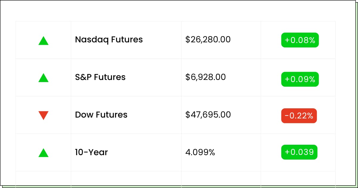 | | Futures at a Glance📈 | Futures are leaning lower as traders chew on mixed Big Tech results, with one search giant getting cheers while social and cloud heavyweights sag. A Trump–Xi cooldown on tariffs and rare earths is softening the drag, but Powell's cautious tone keeps everyone from sprinting. Expect a choppy open while the market decides whether AI spend is fuel or a tab that stings. | |