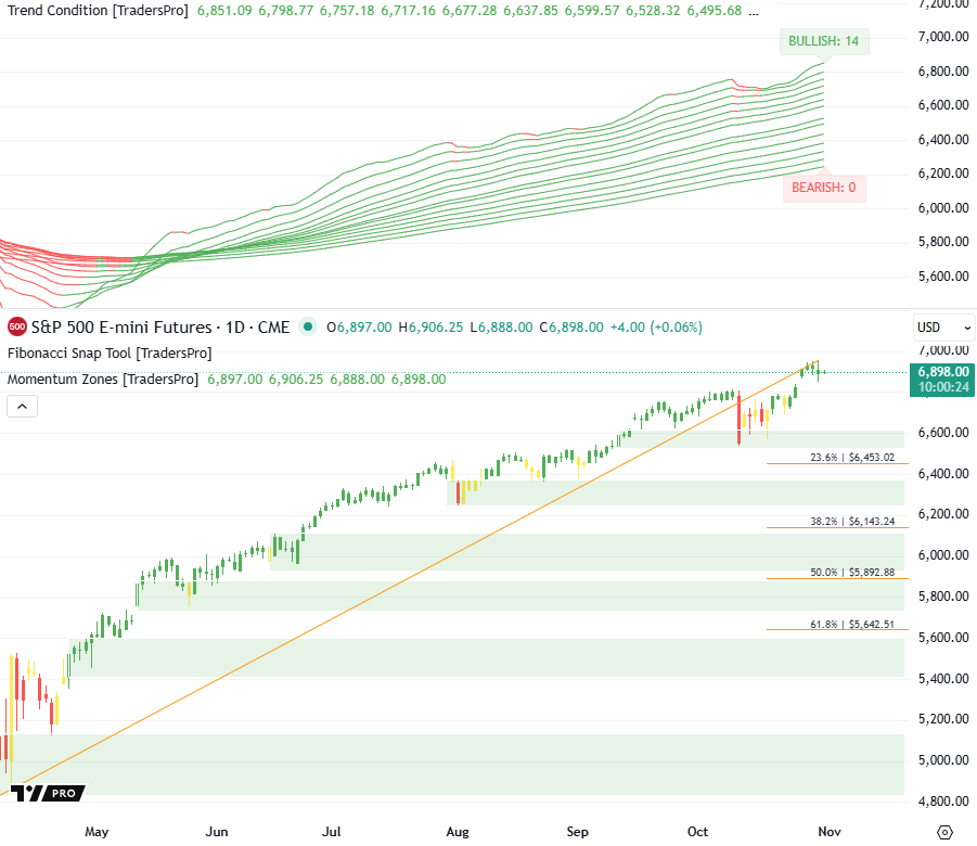 Market Overview: S&P 500 futures hover near their recent highs with full bullish alignment intact, showing continued momentum strength while expansion remains measured and controlled.