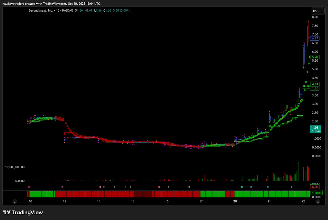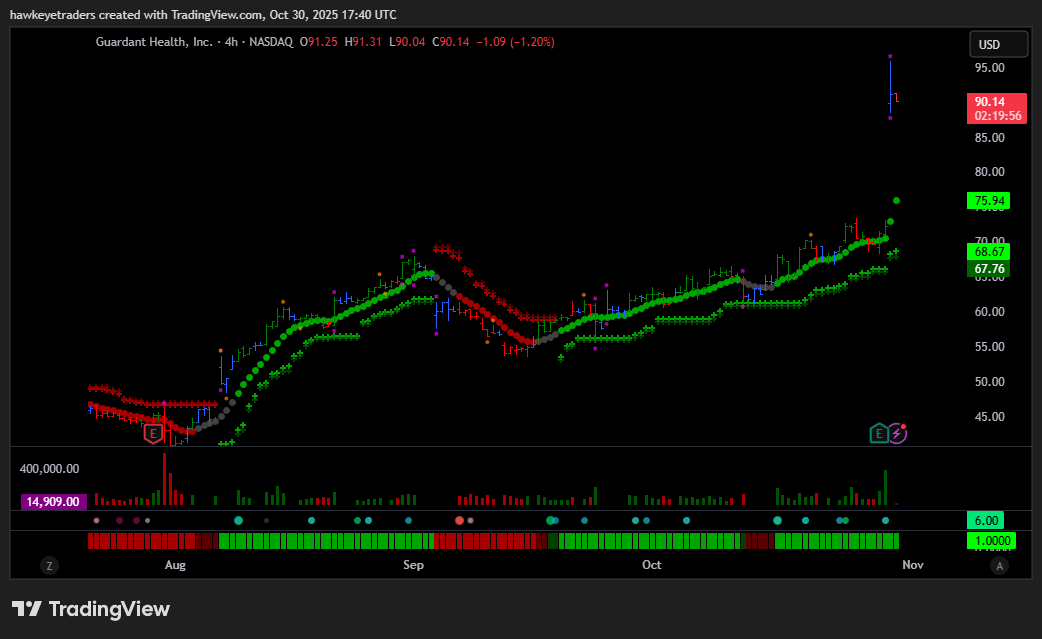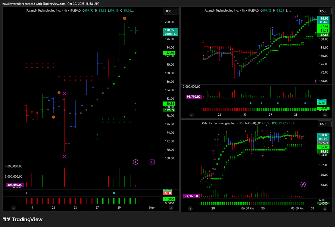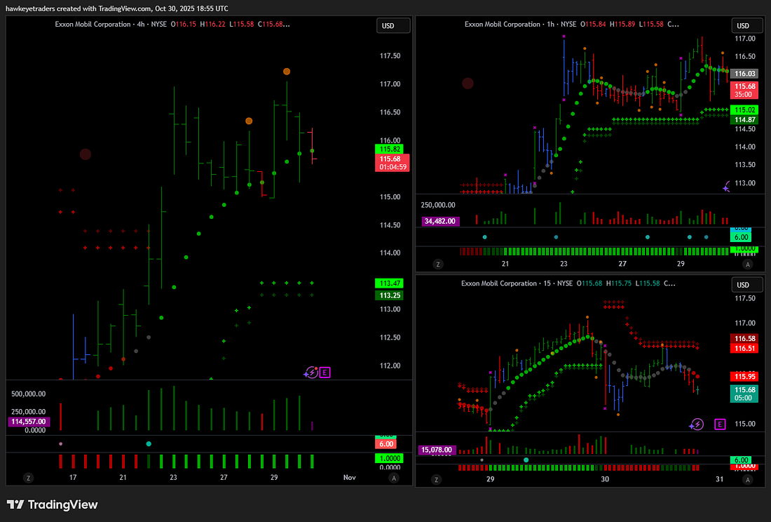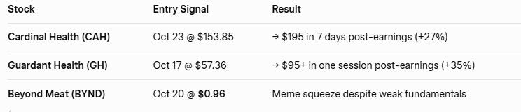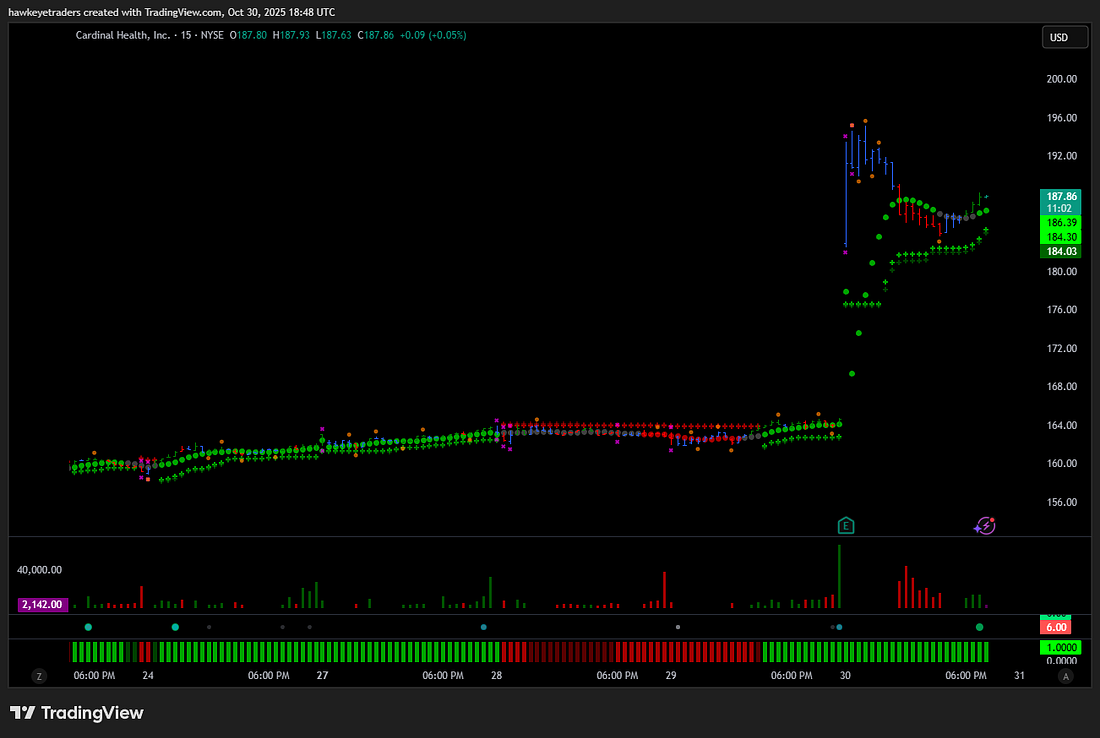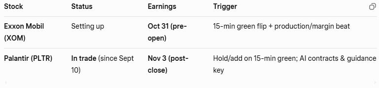 It’s that time again — earnings season — when stocks start popping off the screen as companies report results. Just today, Cardinal Health (CAH) and Guardant Health (GH) both exploded higher after releasing blowout numbers. CAH jumped from around $153 to $195 in a week. GH went from $70 to over $95 in a single session. Both had the same story: And we’re only partway through earnings season… there are still dozens of names yet to report. Stocks I am Looking At NowExxon Mobil (XOM) Exxon is setting up for a potential breakout. On the 1-hour and 4-hour charts, volume and trend are perfectly aligned, both confirming accumulation and strength. The shorter 15-minute chart hasn’t clicked in yet, but once it does, that could be my trigger to step in. Fundamentally, here’s what the market will be watching when Exxon reports on tomorrow: production strength, refining margins, and cost control. The company has been firing on all cylinders in high-return areas like the Permian Basin and Guyana, but falling oil prices could offset some of that production momentum. Analysts are also focused on refining performance, where improved margins could offset softer upstream results. Investors will want to see steady buybacks and dividends, plus commentary around Exxon’s role in the energy transition — carbon capture, hydrogen, and LNG are the buzzwords this quarter. Exxon remains one of the best-capitalized names in the sector, with strong free cash flow and a dependable dividend. What could move the stock meaningfully higher is execution: better-than-expected production, higher margins, or a more confident outlook. If we get that combination, and my shorter timeframe signals align, I’ll be ready to take it. Next up is… Palantir Technologies. We’re already in this trade — the first entry signal came back on September 10th, and it’s been trending well ever since. Palantir reports earnings on November 3rd, and volume remains strong across multiple timeframes. Depending on what the 15-minute chart shows on the day of earnings, I may look to add or take partial profits, but for now the setup still looks great. Palantir’s story is simple but powerful: it’s a company that helps governments and enterprises make sense of massive data sets. Their platforms — Gotham, Foundry, and AIP — are embedded in everything from defense systems to private-sector analytics. The fundamentals are solid. Last quarter, revenue grew 48% year-over-year to just over $1 billion, margins expanded, and profitability continued to improve. But the valuation is rich, and that’s where things get interesting — when expectations are high, the smallest surprise (good or bad) can move the stock fast. Heading into earnings, investors will be watching for major contract wins with U.S. and international agencies, continued commercial growth, and momentum in AI. They’ll also be looking for raised guidance and margin expansion to justify the premium. Right now, the chart is showing persistent buying pressure and trend confirmation across timeframes. If that continues through earnings, this could be one of the strongest momentum stories of the season. You can see the 15 minute chart just went from green to grey. This just means hold for those in that are in the trade. If we see this jump back to green it will be a good entry for new traders. These are the kinds of setups I love — where the technicals are already leaning bullish, and we just need the fundamentals to catch up. And lately, that pattern has been playing out again and again. Just this week, two of our recent positions did exactly that. When Fundamentals Don’t Matter — Beyond Meat (BYND)Not every big move needs good fundamentals behind it. Sometimes the story is pure sentiment — and the chart still tells it before it happens. Beyond Meat (BYND) was a perfect example. On October 20th, my indicators triggered a buy signal around $0.96 on the 15-minute chart. It lined up across the 1-hour and 4-hour timeframes, showing that something unusual was brewing under the surface. A few days later, the stock ripped higher — not because the company turned profitable or launched a breakthrough product, but because the crowd showed up. Retail traders piled in through options, call volumes spiked, and social chatter pushed it into “meme stock” territory again. Short interest was massive — roughly 80% of the free float — so when the price started to move, short covering added fuel to the fire. Even the media joined in, with Beyond Meat getting attention for being added to a meme-stock ETF. That kind of visibility draws in momentum traders, which creates the classic squeeze setup. None of it had anything to do with fundamentals. In fact, the fundamentals are still weak — falling revenue, continued losses, and dilution concerns. But that’s exactly the point. The chart told us the move was coming before anyone could explain it. This is why I always say: price and volume reveal intent long before the narrative catches up. Sometimes the fundamentals confirm the story — and sometimes, like in Beyond Meat’s case, they just get left behind. And one more — Guardant Health (GH)A few days later, we saw the same pattern in Guardant Health. Our indicators gave a buy signal on October 17th at $57.36, and the stock climbed gradually until earnings — then blasted from $70 to over $95 in a single session. The catalysts? Big ones. Once again, everything that the headlines celebrated was already visible in the chart. Volume was rising, trend structure was firm, and multiple timeframes were lined up days before the announcement. That’s the edge — seeing what the market’s preparing for, not what it’s already celebrating. That’s what I mean when I say I “spot” moves before they happen. Learning how to spot these setups early could make the next few weeks incredibly productive. Every trader has that moment where they see a stock explode higher and t