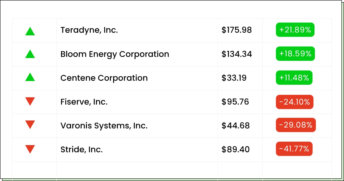 | Teradyne [TER]: Premarket Move: +20% | The chip-tester just rang the bell with a better quarter and a loud outlook tied to the AI build-out. | There were more gadgets to test, so more work for the tester. A C-suite shuffle is in the mix, but the headline is simple, orders are hot, and the stock is moving higher. | My Take: Don't chase a sprint. If you like it, wait for a breather and then scale in instead of buying at full tilt. |