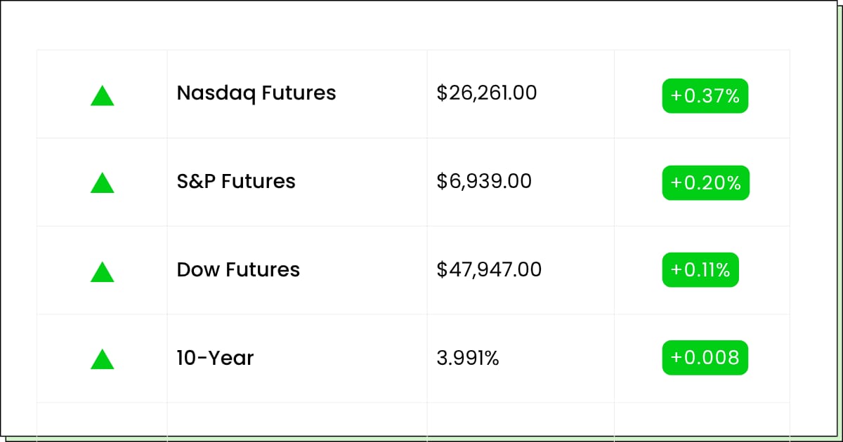 | | Futures at a Glance📈 | Futures are mixed as traders wait on the Fed and Powell's tone. Nvidia is jumping toward a new valuation milestone while mega-cap results kick off after the close and continue tomorrow. Trade tensions have cooled ahead of a Trump–Xi meetup, but rich valuations and the ongoing government shutdown are still the flies in the champagne. | |
