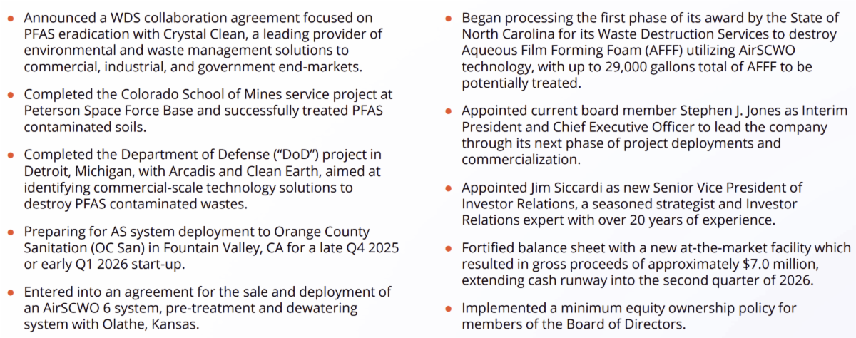 This project represented a major step forward in our effort to provide the DoD with commercial PFAS treatment options for a variety of scenarios and waste types. This DoD initiative combines methods for concentrating and destroying PFAS, both on- and off-site, highlighting the growing demand for reliable and modular PFAS destruction technologies across federal, state and municipal government agencies. We are highly focused on bringing our Waste Destruction Services (“WDS”) – a modular solution to eliminate PFAS, hazardous, and non-hazardous wastes – to market,” concluded Jones.