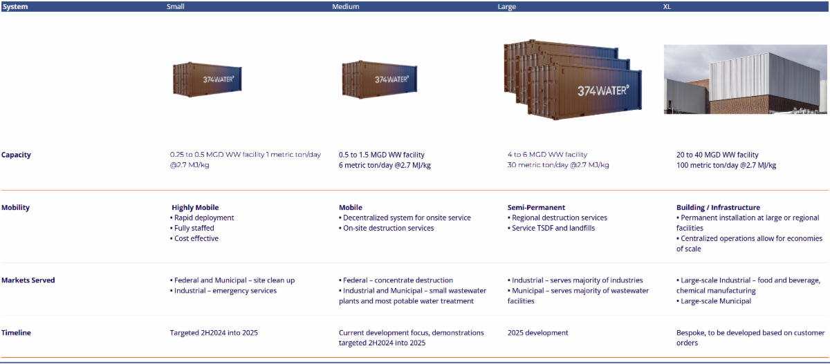 374Water is developing AirSCWO Systems to meet the various destruction capacity needs of the Municipal, Federal and Industrial markets. The Company is currently focused on developing and eventually commercializing our Medium Capacity System (6 metric ton per day).