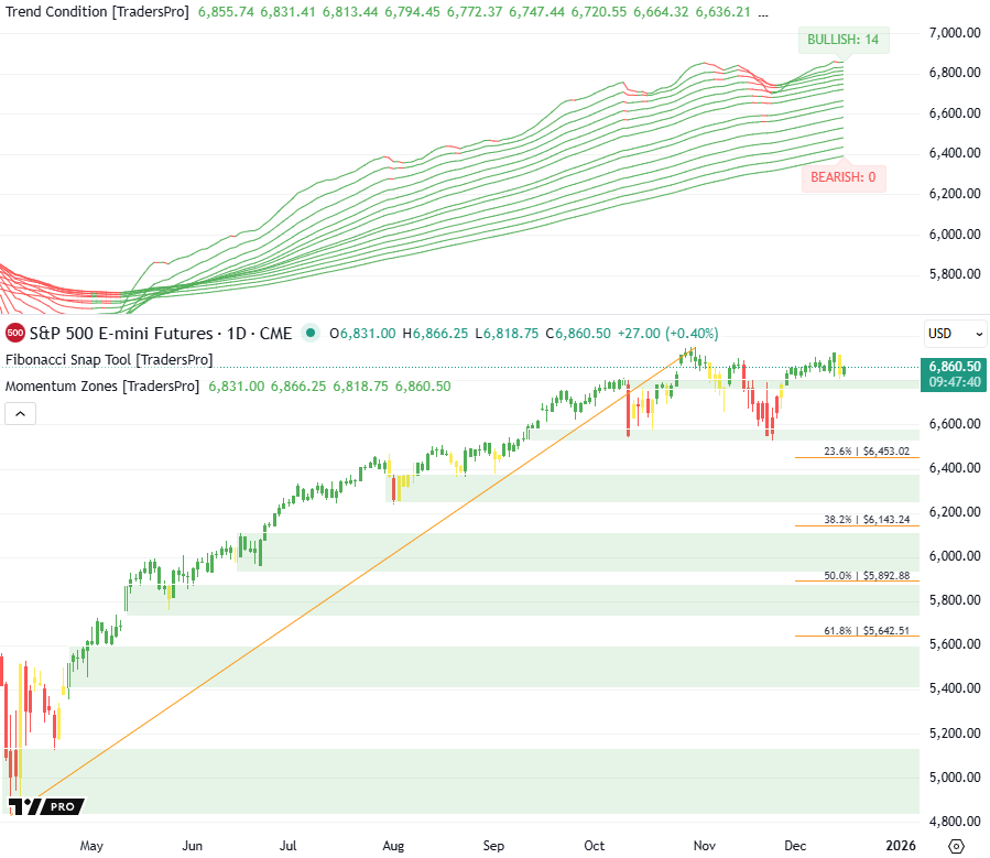 Momentum Zone Holds as Buyers Step InBuyers continue to defend shallow demand, and today’s rebound reinforces the trend-aligned posture despite repeated hesitation near the resistance boundary.New To TradersPro? Market Overview: S&P 500 futures remain in a strong uptrend, bouncing firmly off friday’s pullback and trading higher inside the bullish momentum zone while staying well above shallow Fibonacci support. Bullish/Bearish Trend Analysis Trend Condition: Bullish Trends: 14 Bearish Trends: 0 Trend Condition: Strong Uptrend Trend Structure: wide Probability Outlook: Price Action and Momentum Zones Current Price and Change: Currently, the S&P 500 Futures are at 6,860.50, up by 27.00 pts or 0.40 % vs the prior session shown on the chart. Market Behavior: Today’s candle is a solid green bar showing renewed buying interest after yesterday’s decline, with price lifting off support and pressing again toward overhead resistance in a controlled manner. Momentum Zones: Price remains well above the 23.6 % retracement and firmly inside the bullish momentum zone. Buyers continue to defend shallow demand, and today’s rebound reinforces the trend-aligned posture despite repeated hesitation near the resistance boundary. Fib Retracement Levels Current Position Relative to Levels: The market is currently above the 23.6 % Fib retracement on this chart. Analysis: Staying above the shallow 23.6 % retracement keeps the recent decline categorized as a normal pullback within a strong uptrend. Deeper Fibonacci layers remain untouched demand zones, and the immediate focus is whether today’s rebound can build enough momentum to challenge or break through the nearby resistance shelf. Overall Market Interpretation: Today’s bounce restores upward pressure within the broader strong uptrend. Price remains in the bullish momentum zone, all trend lines remain aligned upward, and shallow support continues to hold cleanly. Though resistance has repeatedly capped upside extensions, the overall structure favors continued strength or sideways consolidation unless shallow support breaks. New To TradersPro? Daily Trade Idea |