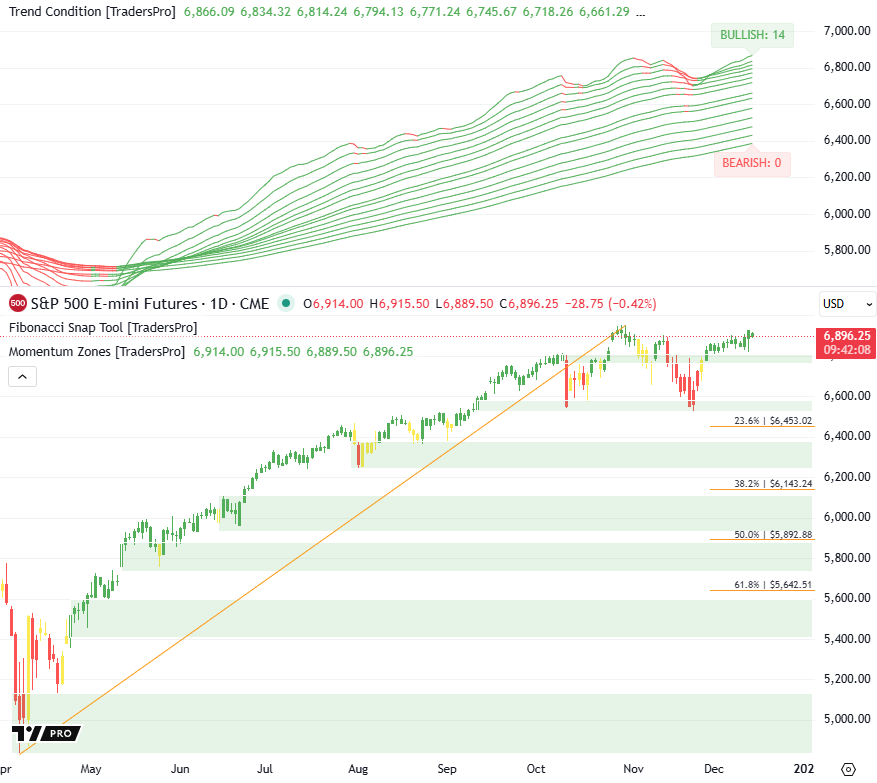 Resistance Pushback Slows Momentum AgainThis placement shows buyers still maintaining control of the broader trend, even as short-term momentum fades and price oscillates beneath resistance.New To TradersPro? Market Overview: S&P 500 futures remain in a strong uptrend, pulling back modestly inside the bullish momentum zone while staying well above shallow Fibonacci support. Bullish/Bearish Trend Analysis Trend Condition: Bullish Trends: 14 Bearish Trends: 0 Trend Condition: Strong Uptrend Trend Structure: wide Probability Outlook: Price Action and Momentum Zones Current Price and Change: Currently, the S&P 500 Futures are at 6,896.25, down by 28.75 pts or 0.42 % vs the prior session shown on the chart. Market Behavior: Today’s candle is a red bar showing a sharper intraday pullback compared with recent sessions, as sellers stepped in near the familiar resistance zone. Despite the decline, the move remains contained within a larger sideways structure. Momentum Zones: Price continues to trade above the 23.6 % retracement and inside the bullish momentum zone. This placement shows buyers still maintaining control of the broader trend, even as short-term momentum fades and price oscillates beneath resistance. Fib Retracement Levels Current Position Relative to Levels: The market is currently above the 23.6 % Fib retracement on this chart. Analysis: Remaining above the shallow 23.6 % retracement keeps the current decline labeled as a controlled pullback inside a strong uptrend. The deeper Fibonacci bands remain untouched support zones, while the primary near-term question is whether price continues to digest beneath resistance or drifts back toward shallow support for another test. Overall Market Interpretation: Today’s decline reflects renewed hesitation beneath resistance rather than structural deterioration, as the broader trend remains fully bullish with wide spacing and intact momentum-zone support. The chart continues to favor strength or sideways consolidation unless shallow support gives way, with sellers so far only able to slow—not reverse—the uptrend. New To TradersPro? Daily Trade Idea |