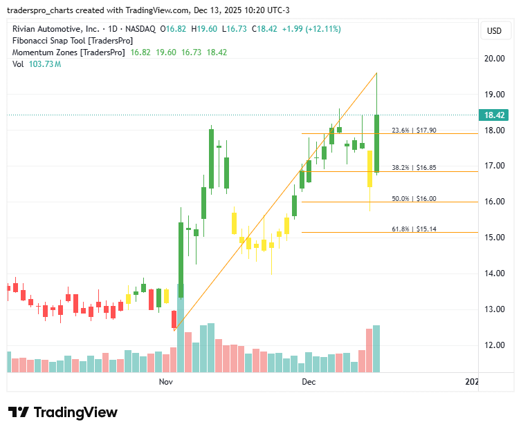 Rivian (RIVN): EV Demand Supports Niche StrengthRivian is gaining traction as production improves and demand strengthens for electric trucks and commercial platforms positioned for long-term adoption.New To TradersPro? Rivian Automotive, Inc (RIVN) builds electric trucks, SUVs, and commercial delivery vans with a focus on durability, long-range capability, and software-driven performance. Its growth has been driven by improving production efficiency, increased demand for adventure-oriented EVs, and deeper integration of its commercial platform. EV makers today face a shifting landscape where consumer interest is stabilizing after years of rapid expansion. Rivian benefits from buyers looking for reliable alternatives that offer utility, towing capacity, and outdoor functionality—areas where the company has carved out a distinctive niche. The broader auto market is dealing with higher financing costs, yet easing inflation has started to help manufacturers manage input pressures. Rivian continues refining its cost structure, allowing more competitive pricing and greater scalability as supply chains normalize. Supportive government incentives for EV adoption still play a meaningful role in sustaining demand. At the same time, battery technology improvements and domestic supply chain investments provide longer-term tailwinds. On the chart, Rivian recently printed a confirmation bar with rising volume, signaling stronger participation as price pushed into the momentum zone. That move often marks the beginning of more decisive trend behavior as traders respond to fresh strength. A trailing stop helps manage risk by locking in gains as the stock climbs, while still giving the trend room to develop. Setting those stops using Fibonacci retracement levels through the Fibonacci Snap Tool creates a structured framework to stay disciplined. Rivian’s long-term story continues to center on scaling production, converting reservations, and building its commercial partnerships. The company has announced a custom self-driving chip technology, sending the stock higher. Those pillars help define its runway as the EV landscape matures. The company also stands to benefit from ongoing investment in charging networks and grid upgrades, both of which make ownership more practical for a broader audience. For more information about this company visit their official website New To TradersPro? Daily Trade Idea |