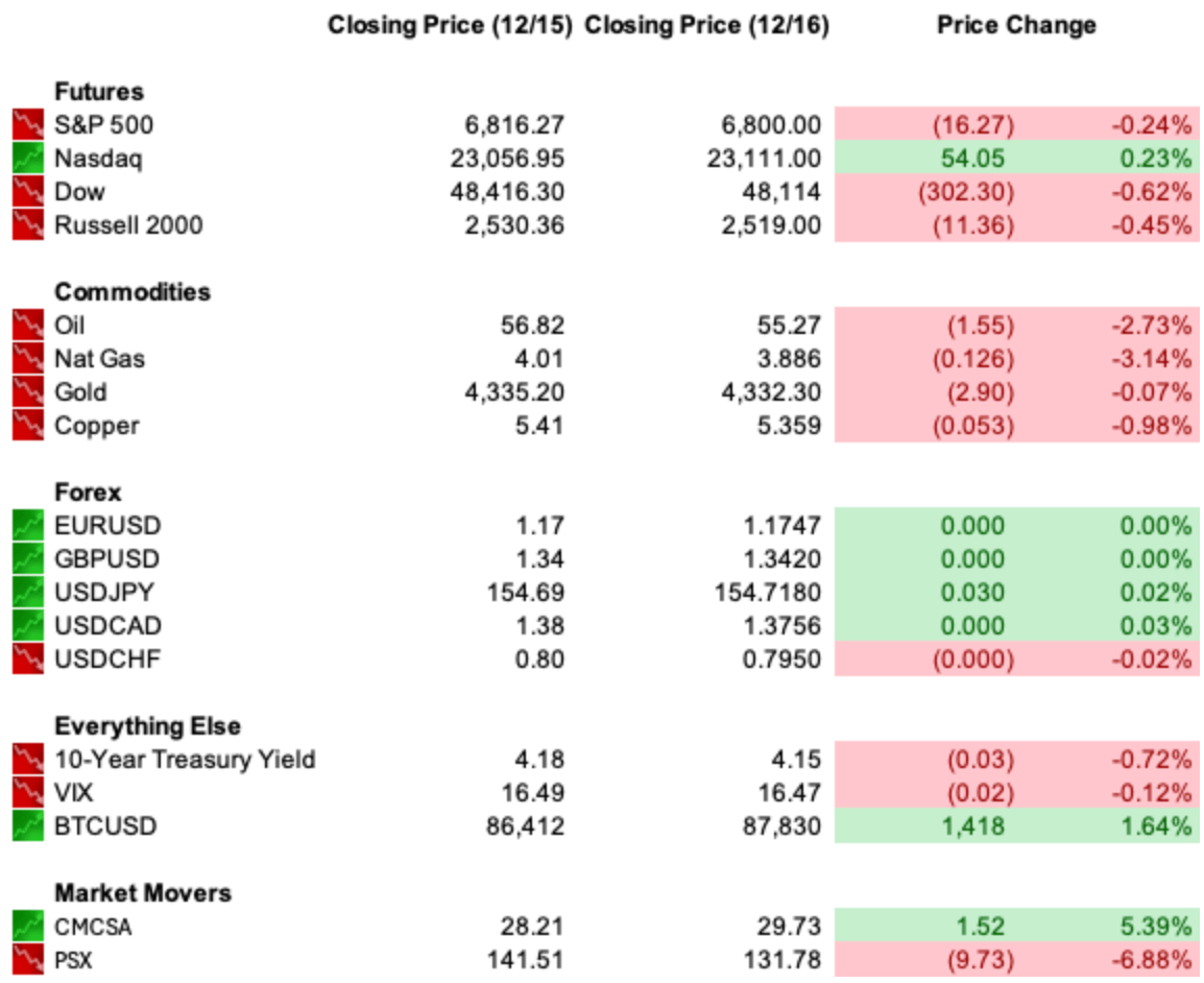 | TQ Evening Briefing | A mixed jobs report and sharp energy selloff shifted market psychology toward caution, without triggering liquidation… a rotation driven by macro texture, not fear. | | | | | | The tape softened, but it didn't fracture… it rotated. | A delayed jobs read gave markets just enough friction to reassess momentum. | Hiring held together in November, but the unemployment rate pushed higher, reinforcing the sense that growth is slowing without stalling. | Equities leaned defensive: the Dow slipped, the S&P logged a third straight decline, while the Nasdaq clawed back into green late as pressure eased. | Yields drifted lower, reflecting a market more focused on cooling demand than overheating risk. | The sharper signal came from commodities. | Oil broke decisively lower, dragging energy stocks to the bottom of the S&P as crude slid to its weakest level since 2021. | That move wasn't about geopolitics, it was macro. | Softer labor trends, stalling retail sales, and growing confidence in excess supply pushed energy from inflation hedge to growth tell. | Beneath the surface, cracks in the AI trade stayed visible. | Bonds tied to heavy AI capex remained under pressure, keeping a quiet check on enthusiasm even as data-center hiring propped up parts of the labor report. | Capital is still flowing… just with tighter scrutiny. | Overall, this wasn't panic selling. It was markets repricing speed. | Growth is still there… but the premium for certainty keeps rising. |
