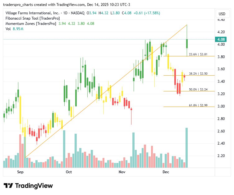 Village Farms (VFF): Greenhouse Technology Supports Consistent OutputVillage Farms is gaining traction as consumer demand rises for sustainably grown produce and controlled-environment agriculture becomes more widely adopted.New To TradersPro? Village Farms International, Inc (VFF) grows high-quality produce and operates controlled-environment agriculture facilities that support both traditional crops and specialty cultivation. The company’s focus on greenhouse technology, sustainability, and premium product lines has shaped its recent momentum as demand grows for reliable, efficiently produced foods. Shifts in consumer preferences continue to favor fresher, locally grown produce with traceable supply chains. Village Farms benefits from this trend as its facilities are designed to reduce waste, limit transportation time, and deliver consistent quality. Commodity volatility has pushed buyers toward producers with stable environments, making greenhouse operations more attractive. Lower energy costs this year have also helped ease one of the biggest pressures in climate-controlled farming. Policy incentives tied to sustainability and reduced water usage give the company added tailwinds. At the same time, ongoing improvements in agricultural technology have supported stronger operational performance. On the chart, VFF printed a confirmation bar backed by rising volume, which signaled renewed interest as price pushed into the momentum zone. This kind of technical shift often highlights improving sentiment as buyers step back in. A trailing stop helps manage the trade by capturing gains while allowing the trend to breathe. Using Fibonacci levels through the Fibonacci Snap Tool creates a clean, rules-based approach to setting those stops and adjusting them as price action evolves. Village Farms’ long-term opportunity continues to center on consistent supply, expanded specialty categories, and leveraging greenhouse efficiencies in markets that value sustainability. As consumers pay closer attention to how food is produced, companies with transparent operations and advanced controlled-environment systems have distinct advantages. For more information about this company visit their official website New To TradersPro? Daily Trade Idea |