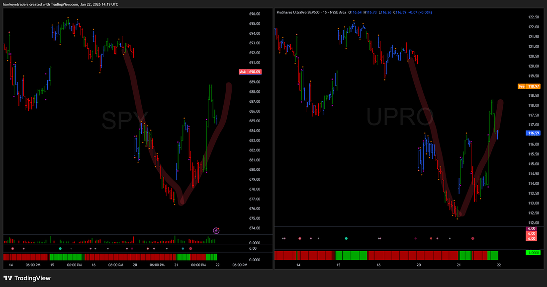 The entire cycle played out in under a week. That compressed timeline is not a coincidence. Modern markets amplify uncertainty faster than they absorb information. And that is precisely why positioning matters more than opinions in the early stages. The Trade That Came With ItFor premium members, this was not just an observation. It was a trade setup. As the market sold off into Phase One, we outlined specific SPY-based levels where risk could be reintroduced with discipline. One of those vehicles was UPRO. Entries in the 112–114 zone provided a clear framework: