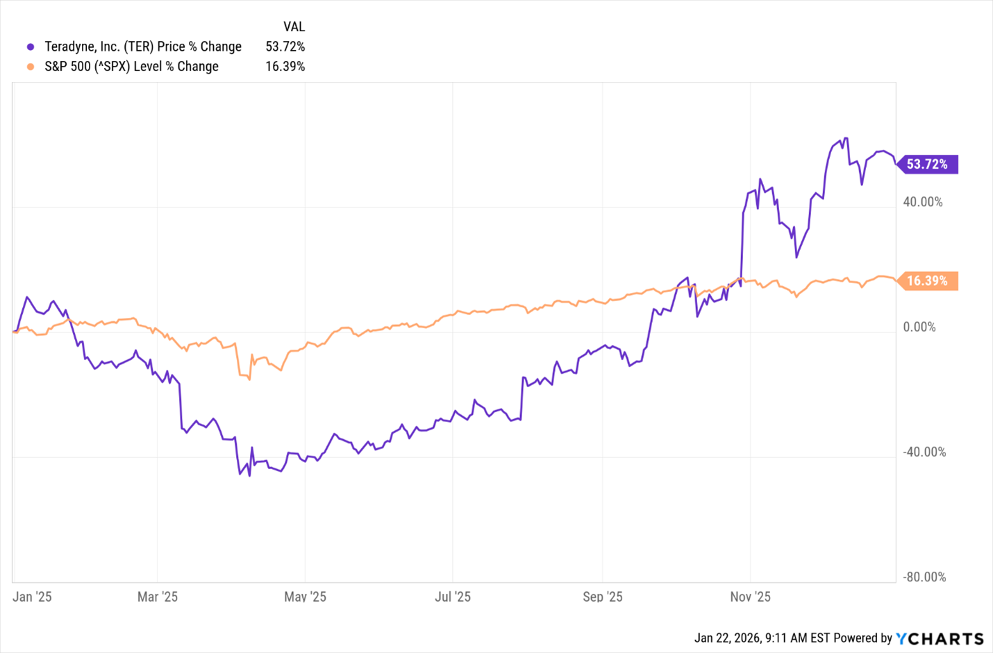 Last year, TER gained 54%, while the S&P 500 rose just 16.4% — meaning Teradyne beat the market by more than 3x.