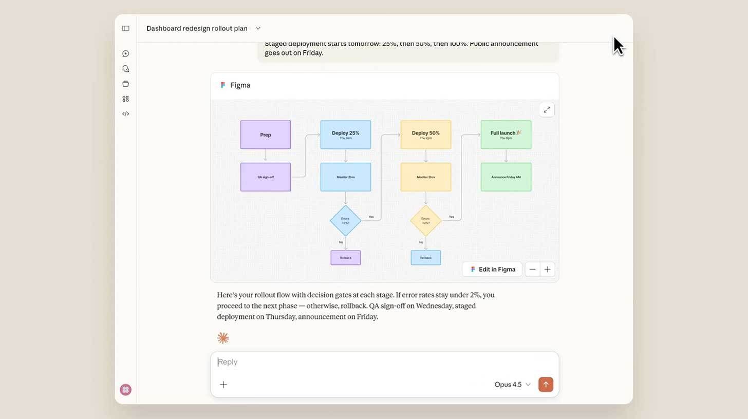 | The Rundown: Anthropic just launched interactive apps inside its Claude AI assistant, allowing users to connect and use apps like Asana, Slack, Canva, and more without ever leaving the chat window. | The details: | The initial rollout includes nine apps: Asana, Figma, Canva, Slack, Box, Amplitude, Clay, Hex, and Monday, with Salesforce coming soon. The integrations run on MCP Apps, a new open extension to Anthropic's Model Context Protocol — meaning other AI platforms can build the same functionality. Actions require user consent prompts before executing, and enterprise admins can lock down which tools employees have access to. The feature ships to Pro, Max, Team, and Enterprise subscribers at no extra cost, with a Cowork integration also coming in the future.