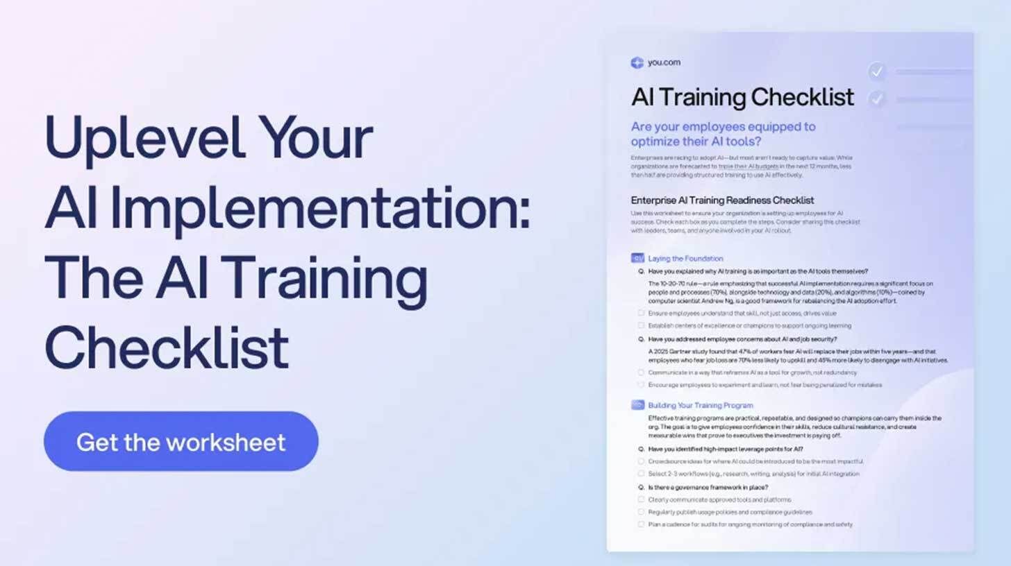| | TOGETHER WITH YOU.COM | | | The Rundown: AI implantation often goes sideways due to unclear goals and lack of a clear framework. You.com's checklist pinpoints common pitfalls and guides you to build a capable, confident team that can make the most out of your investments. | Inside, you'll get: | Key steps for building a successful AI training program Guidance on overcoming employee resistance and fostering adoption A structured worksheet to monitor progress and share across your organization