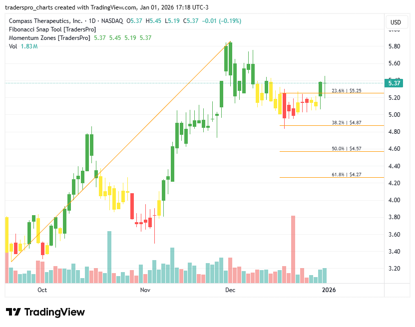 Compass Therapeutics (CMPX): Antibody Engineering Drives GrowthCompass Therapeutics is gaining momentum as precision oncology continues to attract investment, supported by next-generation antibody platforms.New To TradersPro? Compass Therapeutics, Inc. (CMPX) focuses on developing targeted antibody therapies designed to improve treatment outcomes in oncology and immune-related diseases. Its growth is driven by advancing clinical programs and expanding its pipeline of next-generation engineered antibodies, which are gaining attention as precision medicine accelerates across the sector. Biotech has been navigating a mixed macro backdrop, yet oncology research funding and partnerships have remained resilient. As capital continues shifting toward companies with highly specific mechanisms of action, Compass benefits from being aligned with trends favoring differentiated biologics that offer clearer therapeutic advantages. New technologies in antibody engineering are evolving rapidly, helping companies like CMPX refine drug candidates with greater potency and specificity. This shift supports the company’s positioning as investors increasingly look for platforms capable of generating multiple high-value assets rather than single-product strategies. On the chart, CMPX recently printed a confirmation bar backed by expanding volume, a signal that buyers are stepping in with conviction as price moves decisively into the momentum zone. This pattern often reflects improving sentiment ahead of catalysts or a broader shift toward risk-on conditions in biotech. A trailing stop becomes a helpful tool here, letting traders participate in the trend while clearly managing downside risk. Using Fibonacci retracement levels and applying the Fibonacci snap tool provides a structured way to adjust trailing stops as the trend matures. For more information about this company visit their official website. New To TradersPro? |