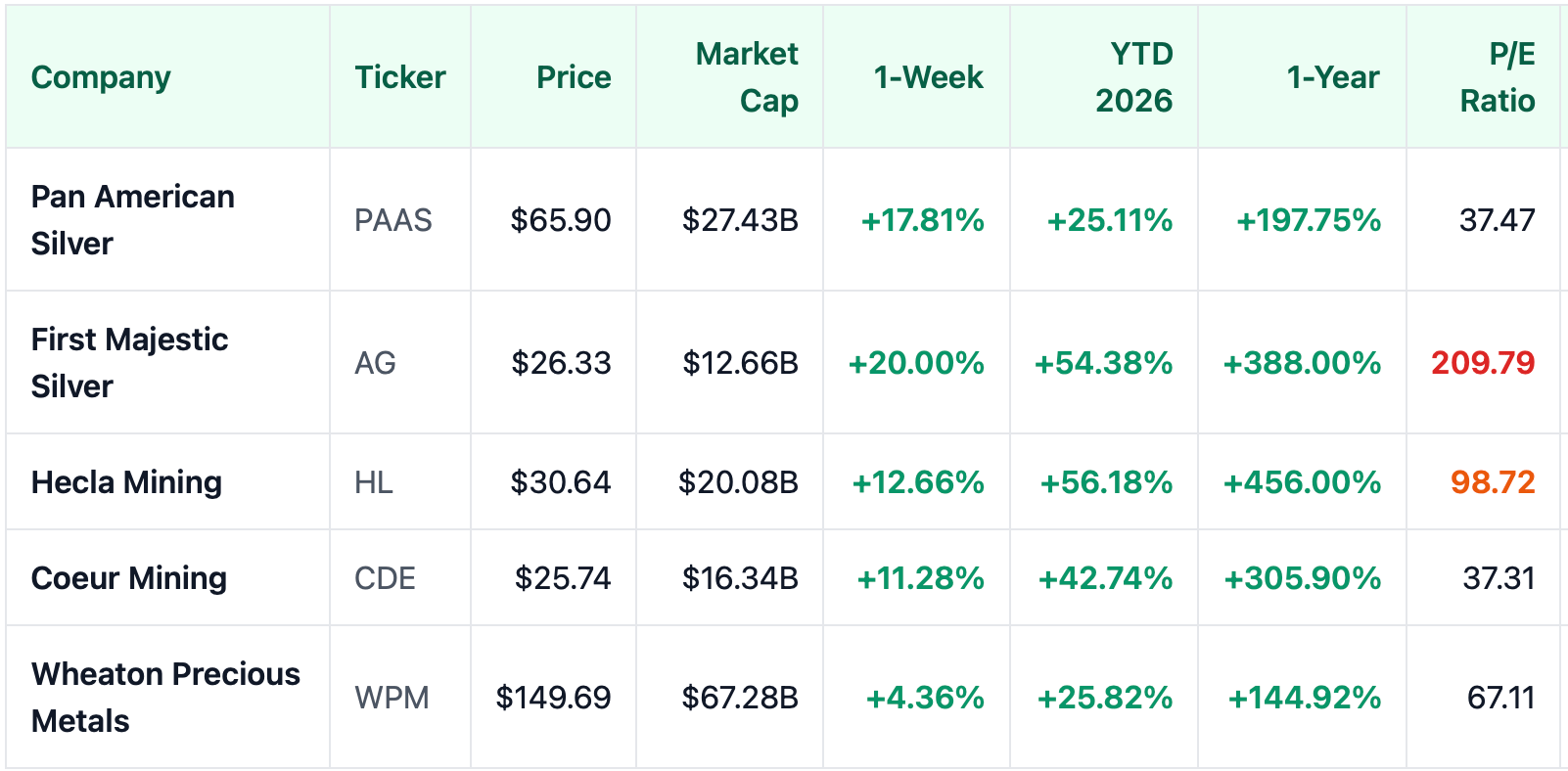 If you want to play silver without buying bars, the mining stocks are where the action is. Here's what the top names look like right now. |