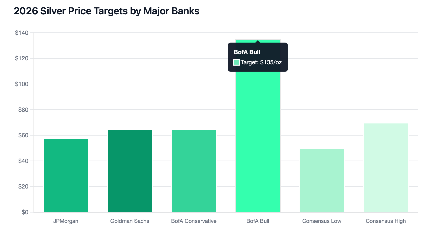 Bank of America's most bullish case sees silver hitting $309 if the gold-to-silver ratio returns to historical norms. Right now, it takes about 50 ounces of silver to buy one ounce of gold. Historically, that ratio has been closer to 40 or even 30. |
