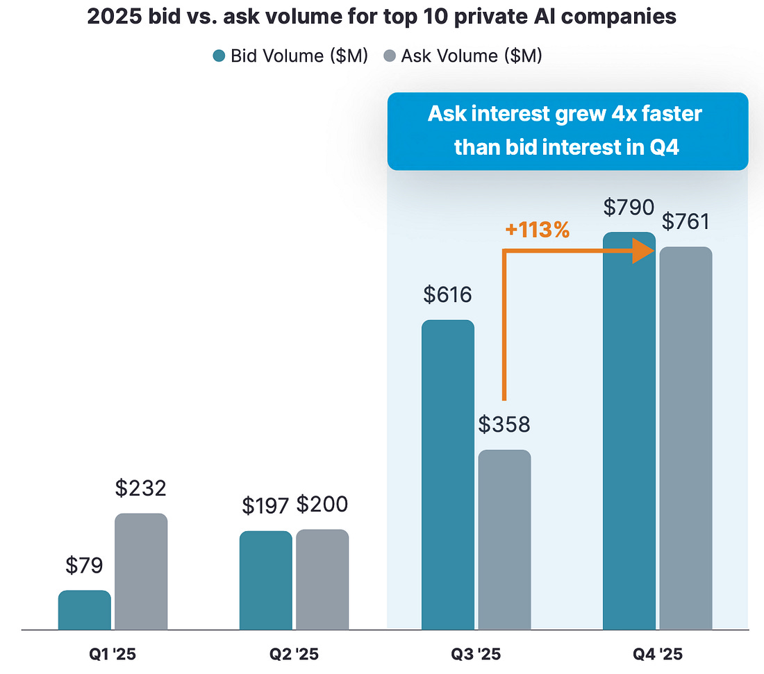 Mercor (+423%), Anthropic (+402%), Skild AI (+368%), Crusoe (+244%), ElevenLabs (+205%), OpenAI (+144%), and Perplexity (+94%) led the way for private AI companies. On the public side, companies like AMD (+77%), Google (+65%), TSMC (+54%), ASML (+53%), NVIDIA (+39%), Microsoft (+15%), and Meta (+13%) saw very solid returns, but paled in comparison to the private market’s stars. The delta is multifactorial, but it’s useful to focus on two key drivers. First, the pure-play AI companies are all private due to AI being a recent phenomenon. Every company built from the ground up with a focus on AI was founded in the past ten years. Google, NVIDIA, and AMD are the closest thing you get to pure AI exposure on the public markets. Second, the private markets are less sensitive to macroeconomic pressures. Investors on the public side trim exposure in the face of geopolitical uncertainty, while the private market is much less reactive in the short/medium terms. The top three private tech companies - SpaceX, OpenAI, and Anthropic - are all aiming to graduate to the public side this year. These 3 companies combined account for 23% of the entire VC pre-IPO market. The big three also accounted for 17% of secondary market activity. Lastly, an interesting shift took place around the end of year mark: investors are now looking to lock in gains as quarter-over-quarter ask volume increased at 4x the rate that buy volume increased. There are three main storylines to watch going forward: IPO Games.Who has the most successful debut? OpenAI, Anthropic, and SpaceX are all three very different companies and it will be peak cinema to watch this blockbuster trio of IPOs pan out in real time. If you are a tech investment banker, get your rest in now. Anthropic is likely expected to have the lowest valuation, but public investors might like them relative to OpenAI, a much more expensive foundation model name. In addition, Anthropic has been making great in-roads into enterprise adoption while OpenAI is leaning into building a consumer oriented platform (ChatGPT Health is a preview of this, expect similar releases in the future, i.e. ChatGPT for Personal Finance). On the secondary market, Anthropic’s valuation skyrocketed in 2025 as investors saw it as a stable, cheaper alternative for foundation model exposure - the company’s secondary valuation grew 2.8x faster than OpenAI’s. I’d even go as far as saying the smart money’s on Anthropic: earlier this week it was reported that Sequoia Capital is joining a private round for Anthropic despite already investing in rival companies OpenAI and xAI. The round is being led by Coatue and GIC. Private Delta.Will private markets go mainstream? The top 10 names are trading at public market valuations, and provided more portfolio growth than the public side. Going forward, the secondary market will need to evolve to support more liquidity, transparency, and ease of access for interested investors. The biggest barrier to a highly liquid secondary market is information asymmetry. Are secondary buyers getting information rights? Where do they sit in the capital stack? How do liquidation preferences affect their exposure? These access barriers are not simple problems. Investors must be cautious. Money Machines.The largest venture capital funds are just getting warmed up. Andreessen Horowitz announced their new $15B fundraise two weeks ago. Founders Fund closed on $5B a year ago. You should expect Thrive to announce a new fund in the next six to twelve months, likely between $7B - $10B. More money than ever has been secured in the hopes of crowning the next Sam Altman or Dario Amodei. The amount of capital at the later stages combined with more transparent secondary markets means that early stage venture capital investors will start taking more chips off the table, earlier. The venture capital market will continue to bifurcate into a16z/FF/Thrive/Sequoia/GC/Lightspeed and boutique early stage investors that don’t touch anything at the Series A stage or onwards. The middle market Series A/B firm is dead, save for sector specialists who have carved out their respective niches. It won’t be long before the pre-seed/seed boutiques start exiting positions entirely when the big boys pick up the tab at Series A/B stages. No more holding for an IPO exit ten years down the road; pre-seed funds are exiting at Series A when a16z turns their portfolio company into a unicorn, just a few years after the initial investment. Be on the lookout for signals that this shift is taking place. Venture capital is now officially two separate asset classes. for your eyes only. |