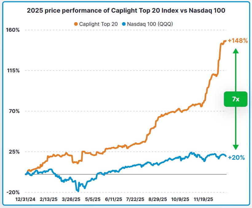 The largest private technology companies outperformed the public markets by 7x in 2025. Caplight’s Top 20 Index is a financial index tracking the performance of the largest late-stage, venture-backed, private companies with active secondary markets. The index is dominated by the largest six companies - OpenAI, SpaceX, Anthropic, xAI, Databricks, Stripe - which account for 86% of the Top 20 Index by valuation. Investors who prioritized access to these names, rather than public market darlings like NVIDIA, Google, Amazon, etc., saw significantly better returns in their portfolios last year. Ultra-high net worth family offices are showing very high demand for OpenAI, SpaceX, and Anthropic in particular. One investor recently told us a story involving an UHNW family trying to get directly on Anthropic’s cap table with a $140M check. The effort was fruitless, and they ended up investing a smaller amount into an SPV that fed into another SPV. A sign of the times. According to Caplight’s data, 2025 was the strongest venture capital secondary market since 2021.