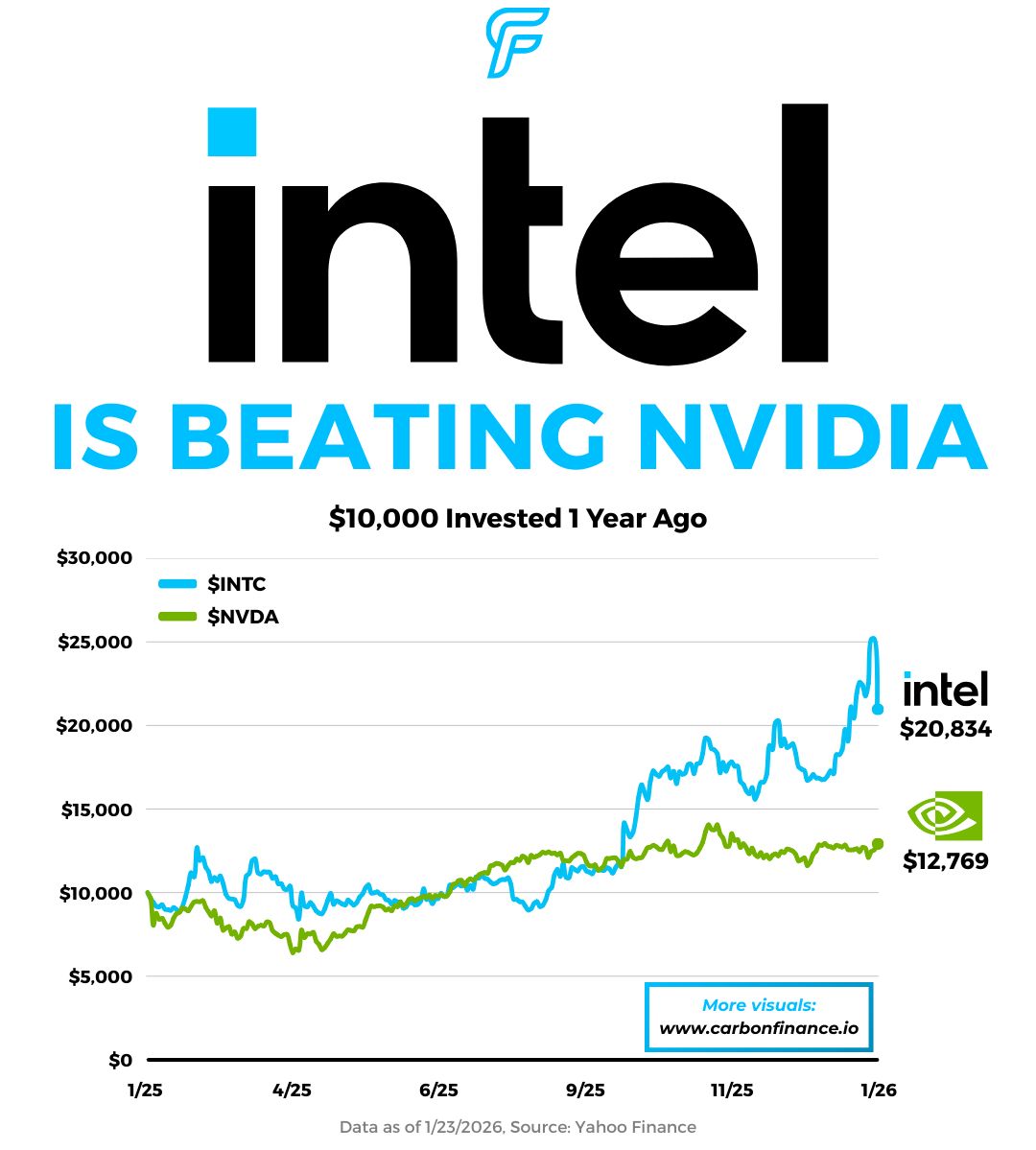 A $10,000 investment in Intel would be worth about $20,834, versus roughly $12,769 in Nvidia.
