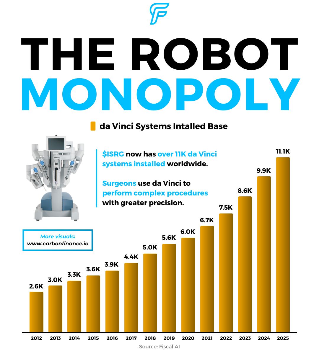 Hospitals use da Vinci for complex, minimally invasive procedures, creating recurring revenue from instruments, accessories, and service contracts. Intuitive Surgical now has more than 11,000 da Vinci systems installed worldwide. That installed base has more than tripled over the past decade.