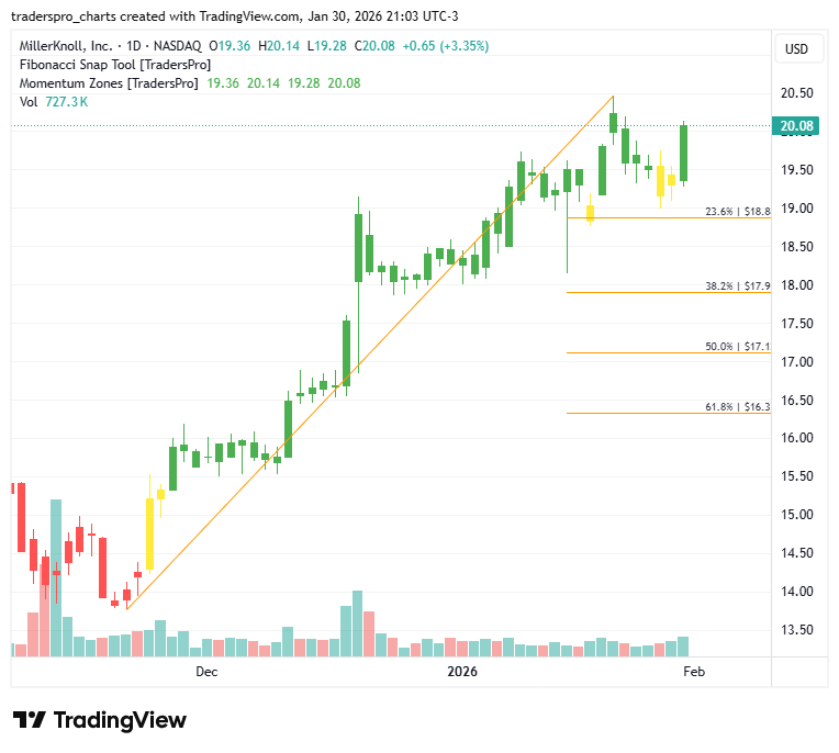 MillerKnoll, Inc. (MLKN): Hybrid Offices Create New Demand CyclesAs hybrid work becomes permanent, companies are investing in flexible, design-driven spaces that support collaboration and employee experience.Follow a Proven Trade Plan MillerKnoll, Inc. (MLKN) is a global design and furnishings company formed from the combination of legacy workplace brands, offering furniture, seating, systems, and interior solutions for offices, homes, and public spaces. Its portfolio spans iconic designs alongside practical workplace products, serving corporate clients, designers, and consumers. The company’s strength comes from brand equity, design leadership, and a broad product mix that adapts to changing ways people work. Growth is being driven by evolving workplace needs as hybrid work becomes more permanent. Companies are rethinking office layouts to focus on collaboration, flexibility, and employee experience rather than dense desk setups. That shift supports demand for modular furniture, ergonomic seating, and adaptable spaces, areas where MillerKnoll’s design-driven portfolio stands out. Residential demand tied to home offices also remains an important contributor. From a technical standpoint, the stock is starting to show constructive signals. The chart recently printed a confirmation bar with increasing volume, indicating renewed buyer interest. That move carried price into the momentum zone, where trends often strengthen as participation broadens and selling pressure fades. As momentum improves, risk management remains key. A trailing stop is a method that adjusts higher as price advances, helping protect gains while allowing the trend to continue. One practical approach is setting a trailing stop using Fibonacci retracement levels, which can be implemented with a Fibonacci snap tool to adapt stops as new price structure forms. For more information about this company visit their official website. Trade Stocks with Confidence. Follow a Proven Plan. TrendCycle Daily |