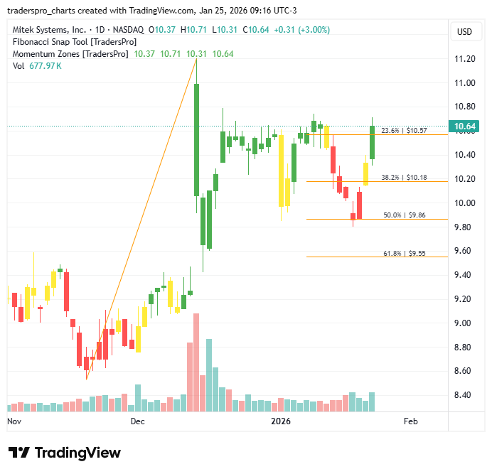 Mitek Systems, Inc. (MITK): AI-Powered Fraud Prevention Gains RelevanceAs digital banking becomes the default, identity verification has shifted from a feature to a necessity, benefiting established platform providers.Trade Stocks with Confidence. Follow a Proven Plan. Mitek Systems, Inc. (MITK) is a software company focused on digital identity verification and mobile capture technology. Its core platforms help banks, fintechs, and enterprises verify users, reduce fraud, and streamline onboarding in a digital-first world. Mitek is best known for its mobile check deposit technology, identity verification solutions, and document authentication tools that are embedded directly into mobile apps and digital workflows. Growth is being driven by the continued shift toward digital banking, online account opening, and remote identity verification. Financial institutions and fintech platforms are under pressure to reduce fraud while keeping customer experiences fast and simple. Mitek’s AI-powered verification tools address this problem by combining automation with compliance-friendly workflows, making them attractive to organizations scaling digital services without adding friction. Digital fraud remains elevated, and regulators continue pushing for stronger identity controls, especially in financial services. This environment benefits companies that already have proven, scalable solutions in place. Mitek’s focus on AI-driven verification aligns well with rising investment in fraud prevention, while enterprise customers look to consolidate vendors and adopt platforms that integrate smoothly with existing systems. From a technical perspective, the stock’s price action shows improving structure. The chart recently printed a confirmation bar accompanied by increasing volume, signaling stronger conviction from buyers. That move pushed price into the momentum zone, an area where trends often accelerate as demand begins to overpower supply and participation broadens. Managing risk remains essential, even in improving trends. A trailing stop helps by adjusting higher as price moves up, protecting gains without forcing an early exit. One common approach is setting a trailing stop using Fibonacci retracement levels, which can be implemented with a Fibonacci snap tool to dynamically follow the trend as new price structure forms. For more information about this company visit their official website. Trade Stocks with Confidence. Follow a Proven Plan. TrendCycle Daily |