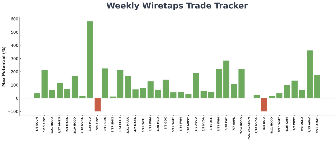 | | Hey Guys & Gals, | Jeff Williams here! | I want you to take a look at the graphic below. | This is our "Trade Tracker," showing the maximum potential return for the alerts I've issued inside of Weekly Wiretaps. |  | Note: Peak trading results are based on Jeff's target entry as specified in his trade plan, calculated using the potential best exit at the highs of the trade. Trade plans may be modified up until execution. These figures do not represent Jeff's personal, realized profits unless otherwise noted. Options trade in a wide range from opening to expiry, and exact profits vary. Trading is difficult; results are not guaranteed and should not be expected to be replicated. |