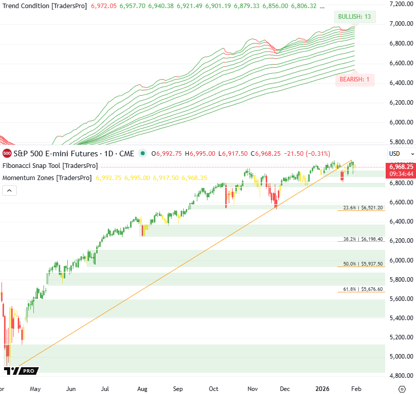 S&P 500 Drifts Lower But Bullish Structure Remains DominantS&P 500 futures are showing short-term weakness within a still-strong uptrend. The dominant trend remains bullish, with the 23.6% Fib level acting as the key reference zone for maintaining momentum.Follow a Proven Stock Trading Plan Market Overview: Bullish/Bearish Trend Analysis Trend Condition: Bullish Trends: 13 Bearish Trends: 1 Trend Condition: Strong Uptrend Trend Structure: wide and slightly flattening at the top Probability Outlook: Price Action and Momentum Zones Current Price and Change: Currently, the S&P 500 Futures are at approximately 6,968, down about 22 points or roughly 0.31% versus the prior session shown on the chart. Market Behavior: Today’s candle is red with a moderate range, showing selling pressure after a recent advance but no decisive breakdown through key structure. Momentum Zones: Price has slipped back toward the upper momentum zone, hovering closer to the 23.6% retracement rather than extending higher, signaling cooling momentum rather than a trend failure. Overall Market Interpretation: Follow a Proven Stock Trading Plan TrendCycle Daily |