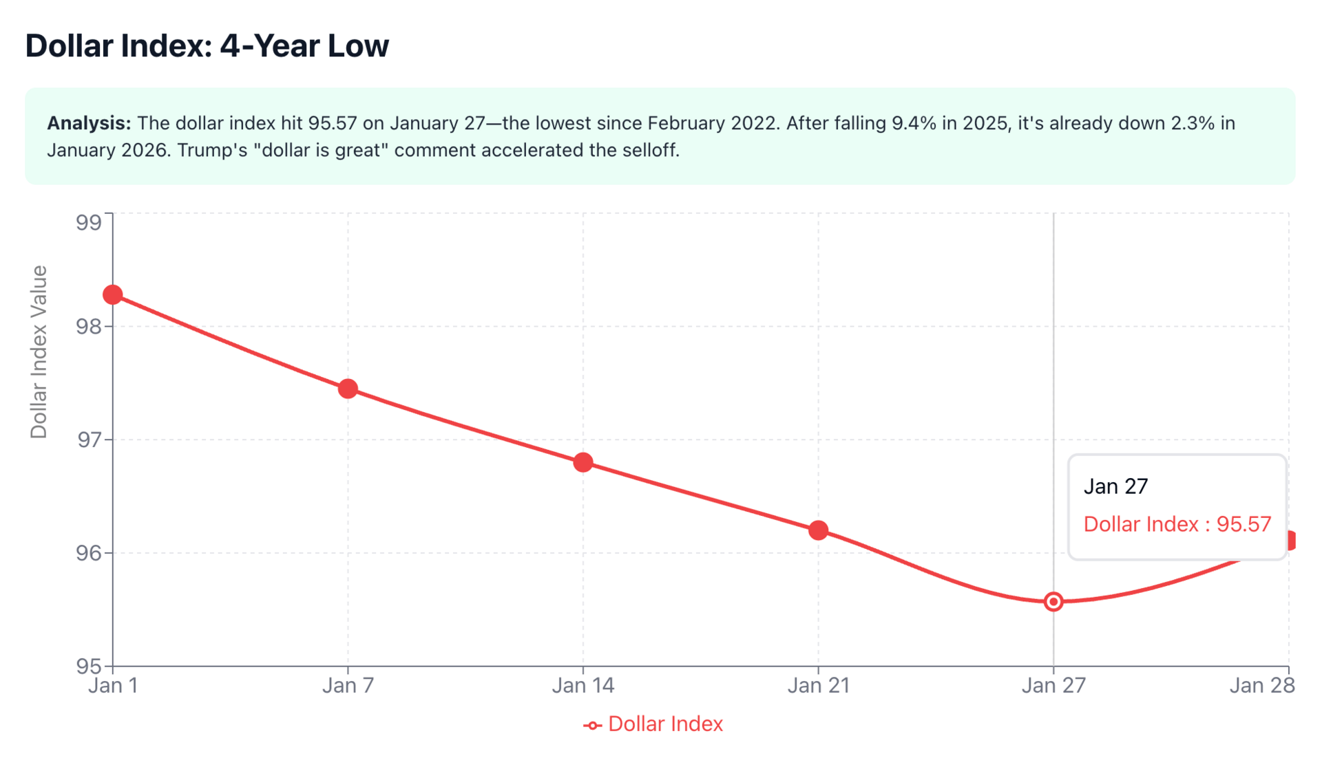 The dollar index dropped over 1% in a single session, reaching 95.57, its lowest level since February 2022. Think about that. Four years. That's a long time in currency markets. |