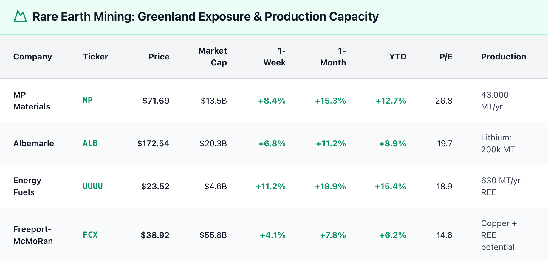 Second, watch the rare earth sector. China controls 80% of global processing. That's a national security problem. Greenland could change that equation overnight. |