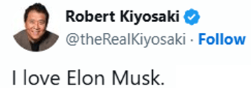 | I've been a fan of Elon Musk for a long time… and I've made this well-known: | | Every company Elon's ever started has returned his earliest investors virtually 100x their money over the long run. | But here's the thing. Most of those huge gains were made by insiders… the well-connected… and venture capitalists like Peter Thiel. | It's like my Rich Dad always told me: the Rich play by different rules. | See, the Rich know how to get in before a company goes public, when the gains are still the biggest. It's all because they know a guy… who knows a guy. | But today we're flipping the script for you. | A friend of ours, a super-connected venture capitalist from New York, recently released a groundbreaking presentation. | And his urgent video will show you, for free, how to claim pre-IPO exposure in SpaceX, Elon's crown jewel . | And as you'll see here, you can do this from your ordinary brokerage account! With less than 50 bucks! | All you need is a 4-letter ticker symbol, which I urge you to write down. | So if you'd like a shot at investing to get exposure to of the most valuable companies of our era — before it goes public — click here now » | | Sincerely, | Robert Kiyosaki