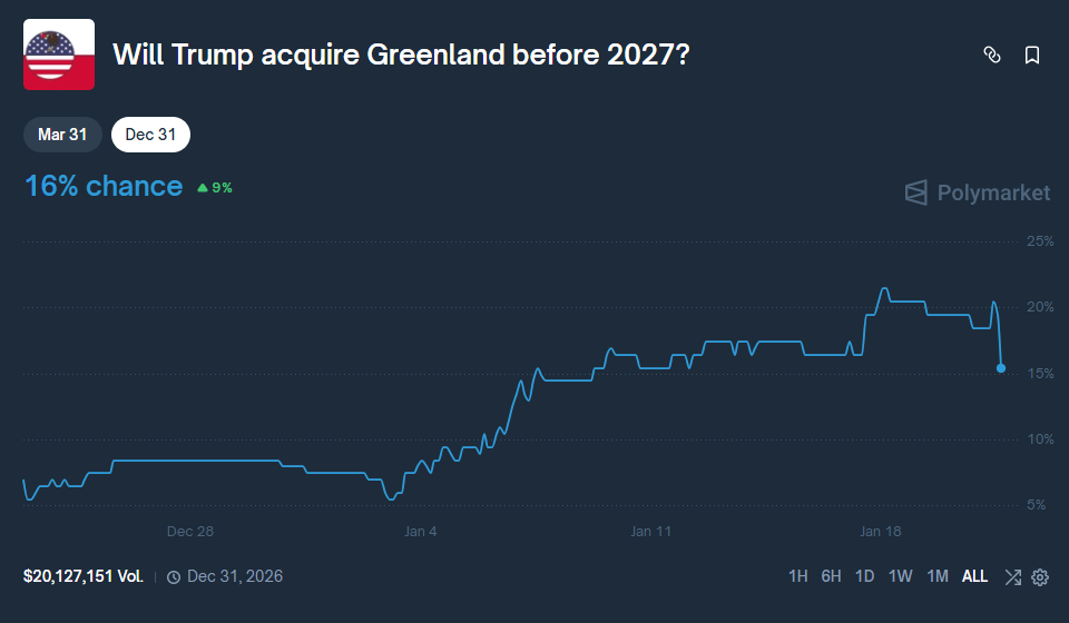Polymarket traders are now pricing in a 16% chance of the U.S. acquiring Greenland. |