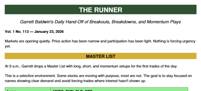 | | Has your retirement plan changed since AI took over the market? If not, that's worth taking a look at… Click Here to Update Your Framework. | | | Good morning, | Well, we're about to witness silver crack above that $100 per ounce line. | Don't tell me I didn't warn you. For the last two months, we've been riding this silver train into the station. All the while, the Greenland stocks I outlined continue to surge, including Energy Fuels (UUUU) and U.S. Antimony (UAMY). | We're experiencing a major shock to the fiat system and ongoing shifts toward real assets that matter. | Roll up your sleeves and sink your hands into the dirt. Because if you don't, you're going to be left behind holding a currency that continues to erode against the world itself. | This morning, we have to return to Japan, where they've (comically) held their interest rate at 0.75%, reminding the world that they're doing all they can to not snap the global financing conditions might force further unwinding of global markets. Japan MUST remain on our radar this year… Otherwise… surprises could come quickly. | Next, we have to discuss Intel's brutal earnings report and guidance. What do we do here after Intel's miss? Is it a trade? And how do we set ourselves up for Friday? | Japan explains why liquidity is fragile. | Intel explains where growth narratives crack. | Geopolitics explains why bonds are the referee. | And Greenland explains where the money is actually going. | These topics… PLUS the Runner (our breakout and breakdown stocks) arrive at 8:45 ET today. | | All you have to do is click the link and I'll see you there. | Stay positive, | Garrett Baldwin |