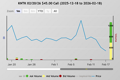 8:15 PM EST Was about to go work out, but then I got a ping. It’s Henry. “You’re going to be sick to your stomach.” Oh great. I quickly look at the futures, did they sell off? Did US bomb Iran? Nope, futures are flat. The typing bubble is moving. Financial Times. Kinetik Holdings has received takeover interest from Western Midstream Partners. Backed by Occidental Petroleum. Sale process initiated. $7.2 billion. Before I could type back... “Yes, I checked multiple sources. You were close, but I know it probably stings.” Took a look at the after-hours price. $48 x $50, up another 9%. Looked at my positions. Nothing. Started doing the math. Looks like these could open up at $4.00 tomorrow. That stings. Would’ve been an $80,000 trade. Knew we didn’t have any, but maybe there was a chance. Nope. Those Feb 45 calls I cancelled six hours ago. 200 contracts. First at 20 cents and then 25 cents, waited and prices just kept increasing. Cancelled the order. Another one -- so close. Right on their heels. Brought up the activity again. 12:28 PM EST Scanner just lit up. KNTK — Permian Basin midstream. Pipeline company. Henry asked, what made this stand out today? Haven’t heard of the stock before today. 1000 contracts on the Feb 45 calls. Paid 15 cents. Stock was up 6% on the day. No news. Someone paid $15,000 betting something happens in two days in an under-the-radar stock. $15,000 doesn’t sound like a lot. But it’s how the order was executed. They used a special order routing system, hit 17 exchanges simultaneously — 32 trades in 0.122 seconds — to buy call options that expire in 2 days. And then at 12:34: 529 contracts in June $45 calls filled at $3.50 from 14 exchanges, 0.004 seconds. The bid/ask was $1.50 x $3.50. What’s wild is those Feb 45 calls were up 400% on the day. They’re sitting on 400% in a few hours. Even if we got filled, we’d have sold into that move. You take the money. Never know how good the information is they’re acting on. They timed it right, with the right information. Spotted at 12:28. FT confirmed it at 8:15. Posted the activity on X earlier. Maybe the SEC will see it. About This Journal: Every entry documents what really happens at my desk. The losses, wins, and everything between. Trading Alliance -- every alert, every research report. Group Mentorship -- the craft behind the trades. Josh Belanger's results are not typical and are not a guarantee of your success. Josh is an experienced investor and your results will vary depending on education, work experience, and background. Josh does not personally participate in every investment alert he provides. Due to sensitivity of financial information, we do not know or track the typical results of our students. Josh’ strategies may not always be accurate, and his investments may not always be profitable. They could result in a loss of an entire investment. We cannot guarantee that you will make money or that you will be successful if you employ his trading strategies specifically or generally. Consequently, your results may significantly vary from his. We do not give investment, tax, or other professional advice. Reference to specific securities should not be construed as a recommendation to buy, sell or hold that security. Specific securities are mentioned for informational purposes only. All investments involve risk, and the past performance of a security, industry, sector, market, financial product, investment strategy, or individual’s investment does not guarantee future results or returns. Investors are fully responsible for any investment decisions they make. Such decisions should be based solely on an evaluation of their financial circumstances, investment objectives, risk tolerance, and liquidity needs. |