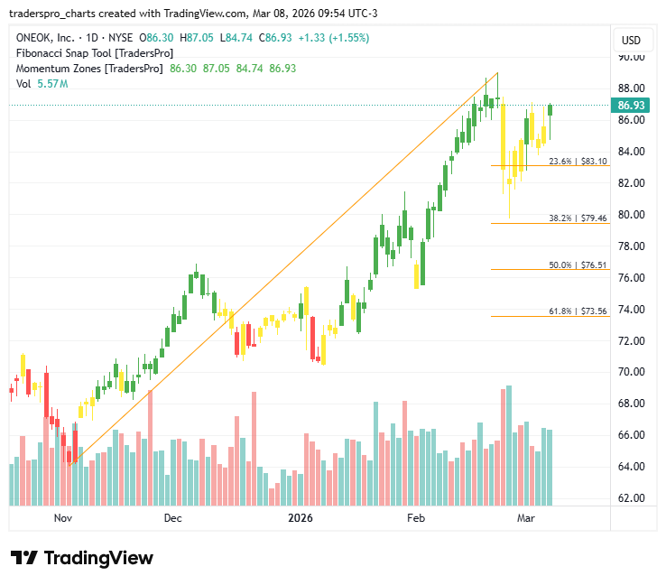ONEOK, Inc. (OKE): Natural Gas Infrastructure LeaderAs natural gas production expands and LNG exports rise, midstream infrastructure providers are positioned to benefit from sustained volume growth.New To TradersPro? ONEOK, Inc. (OKE) is a leading midstream energy company focused on gathering, processing, transporting, and storing natural gas and natural gas liquids across key U.S. basins. The company operates an extensive pipeline and fractionation network that connects production regions with major demand centers. Its core business revolves around fee-based contracts, which provide revenue stability tied to volumes rather than direct commodity price exposure. Growth is being driven by continued strength in U.S. natural gas and NGL production, particularly in shale regions such as the Permian and Mid-Continent. Rising demand for liquefied natural gas exports and petrochemical feedstocks has increased the need for reliable transportation and processing infrastructure. Recent asset expansions and integration of complementary midstream assets have strengthened ONEOK’s footprint and enhanced scale across critical energy corridors. Energy markets remain influenced by global supply dynamics, export demand, and domestic power generation trends. Natural gas continues to play a central role in electricity generation and as a bridge fuel in the energy transition. Infrastructure constraints in key basins have supported long-term investment in pipelines and processing capacity, benefiting established operators with existing networks and regulatory experience. On the chart, shares recently printed a confirmation bar with increasing volume, signaling renewed institutional participation. That move carried price into the momentum zone, where sustained buying pressure can extend trends as supply is absorbed and confidence builds. As the uptrend develops, protecting capital remains essential. A trailing stop rises alongside price, helping investors lock in gains while allowing the position to run. One structured approach is anchoring the stop to Fibonacci retracement levels and updating it using the Fibonacci snap tool as new swing highs form. This balances opportunity with discipline. For more information about this company visit their official website. New To TradersPro? TrendCycle Daily |