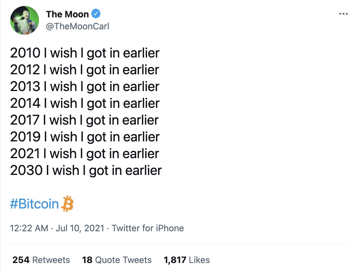 By learning my #1 way to take advantage of the new crypto boom – for free… And grabbing the details on two more crypto plays – one that could turn £500 into more than £10,800 (before costs and fees)… I'll show you how – during my Race to Bitcoin $1,000,000 broadcast. Sincerely, Sam Volkering The Race to Bitcoin $1,000,000 PS – Browsing Twitter the other day, I stumbled across the post below. It pretty much sums up my stance regarding the best time to buy bitcoin. Source: Twitter If you've been holding off on dipping your toe in this market… If you've been listening to the warnings of the naysayers and the Belgravia elite… Maybe it's time to explore a different perspective. |