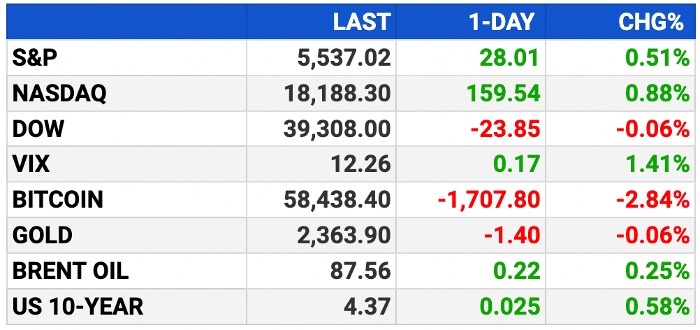 | | Your 5-minute briefing for Friday, July 5: | | BEFORE THE OPEN |  | As of market close 7/3/2024. Bitcoin as of 7/4/2024. |